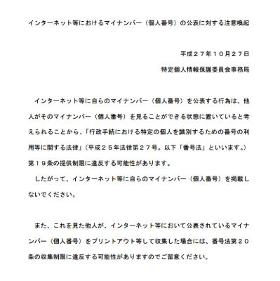 インターネットなどで自分のマイナンバーを公表しないよう、マイナンバーの監視・監督を行う特定個人情報保護委員会が注意を呼びかけている