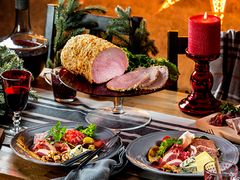 北欧ではクリスマスにメイン料理として、塩漬けの豚肉のかたまりをオーブンで焼く伝統料理「クリスマスハム」を食べる風習があります。今回のセットでは、このクリスマスハムの食べ放題と、カモの燻製(くんせい)、シカの生ハム、チーズ、スモークナッツなど12品目がのったプレートを、500円で販売。しかもスウェーデンで冬に飲まれるスパイス入りワイン「GLÖGG(グロッグ)」も1杯100円で提供する万全の体制です。
