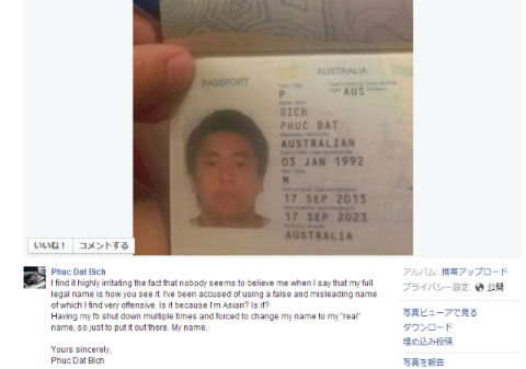 男性は、自身の本名「Phuc Dat Bich」(フ・ダ・ビ)を英語風に発音すると下品な意味の言葉になるため、偽名だと疑われ、Facebookに何度もアカウントを停止されたと自身のFacebookで語り、証拠としてパスポートの写真も投稿していました。このことは先日メディアで報道され、注目を集めました。