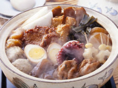 さて、この煮込み田楽、当初は鉄鍋で汁も漬け汁という程度でした。それが明治の中ごろ、本郷でひたひたの汁をたたえた鍋物の「改良おでん」として人気を博すようになりました。「おでん」というのは江戸期に将軍家に仕えた女官の「女房言葉」ですが、幕藩体制が崩壊して後、庶民にこの言葉が降りてきてひろがったわけです。この人気が関西にも伝わり、いわゆる田楽と区別して「関東煮(かんとうだき)」と呼ばれるようになります。もともと関西で生まれた田楽がまったく違う形で関西に逆輸入されたわけですね。関西では関東のようなかつおだしではなく、昆布ダシ、薄口醤油で薄めの色に仕上げ、煮込む具にも蛸や鯨肉、牛筋などを加えて、屋台ではなく座敷でゆっくり食べる形になり、現代の「おでん」の基本形ができあがりました。煮込み田楽は「おでん」となり、さらに仲間が増え、スケールも大きく。