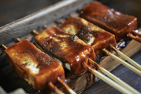 「田楽」は、やがて江戸時代に入ると、外食文化の興隆とともに、屋台で豆腐だけではなくこんにゃくやサトイモ、ナス、魚などもくしに刺し、ゆず味噌や木の芽味噌をつけて石で焼いて提供されるようになりました。魚の田楽は「ぎょでん」ともいわれていたそうです。何だか魚に詳しい今の時代の某タレントさんがつけそうな名前ですが、まぎれもなく江戸時代の話。中でもこんにゃく田楽は女性に人気が高く、田楽の屋台が集中していた南千住の真崎神社付近には、今で言う渋谷のように、若者が若い娘を連れてこんにゃく田楽を食べさせる、なんていうデートもはやったようです。こうして、田楽にはこんにゃくと野菜、魚という新たな仲間が加わりました。