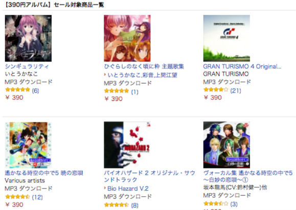 390円対象タイトルは、「ATLUS MUSIC 真・女神転生 サウンドセレクション」「英雄伝説 空の軌跡SCオリジナルサウンドトラック」「ヴォーカル集 遙かなる時空の中で5」「龍が如く」シリーズ オリジナルサウンドトラックなど100タイトル以上。