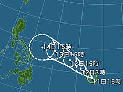 11日午後3時、カロリン諸島で台風27号「メーロー」が発生しました。中心気圧は1002ヘクトパスカル、中心付近の最大風速は18メートル、最大瞬間風速は25メートルで、1時間に25キロの速さで、西北西に進んでいます。