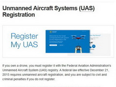 搭載されているカメラなど含めて250グラムから25キロまでのドローンが対象で、登録には氏名や住所、メールアドレスなどが必要。登録すると与えられる番号をドローンに記載し、操縦時に登録証明書を携帯する必要がある。1台につき登録料が5ドルかかる(1月20日まで登録すれば無料)。