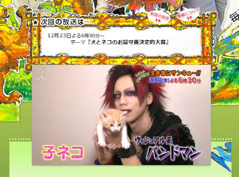 ヴィジュアル系バンドのメンバーが子猫を保護したツイートが以前話題になりました(関連記事)が、その1人と1匹が12月23日放送の「生き物にサンキュー!!」(TBS)に出演します。