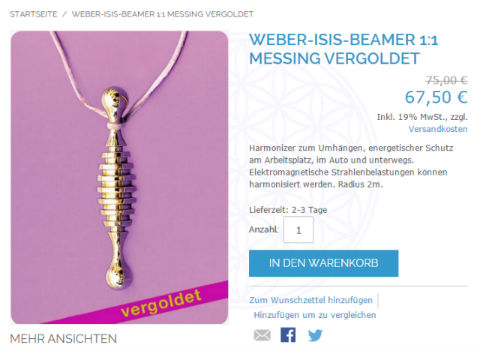 そこで市民にFacebookで情報提供を求めたところ、多数のコメントが寄せられ、ほどなく正体が判明。ドイツの企業が、電磁波から身を守るとうたって販売している健康器具であることが分かりました。67.50ユーロ(約9000円)で売られています