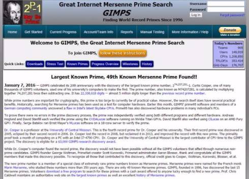 同大のカーチス・クーパー教授は、コンピュータをつなげて“メルセンヌ素数”(注1)を探索するプロジェクト「GIMPS」に参加しており、2013年の素数もクーパー教授による功績です。今回の素数について、実は探索プログラムは2015年9月17日に発見していたものの、関係者が1月7日まで気付かなかったそうです。