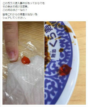 問題の投稿は1月21日に書き込まれたもので、高松上天神店(香川県)で、赤いガラス片がオニオンサーモンに混入してけがをしたため、警察に通報し、救急車を呼んだと書かれていた。投稿にはガラス片の写真も添えられていた。