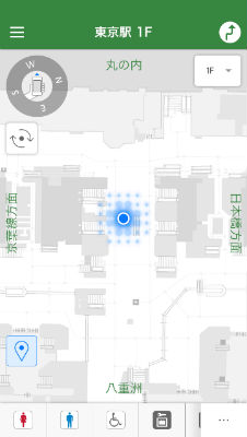 このサービスは無料のナビアプリ「駅構内ナビ」で提供(iOS、Androidに対応)。ユーザーの現在位置を表示したり、出発地から目的地までの経路を案内したり、目印となる施設を使った経路案内を行います。構内に設置した無線ビーコンでユーザーの位置を把握するため、Bluetooth機能をオンにする必要があります。