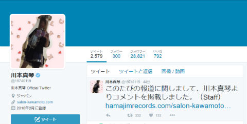 川本さんはこの件について2月初めに「幼稚なツイートによりお騒がせすることになってしまい反省しています」とTwitterでコメントするにとどまっていました(関連記事)が、憶測やそれをもとにした間違った報道がなされているとしてコメントを出すことにしたとしています。