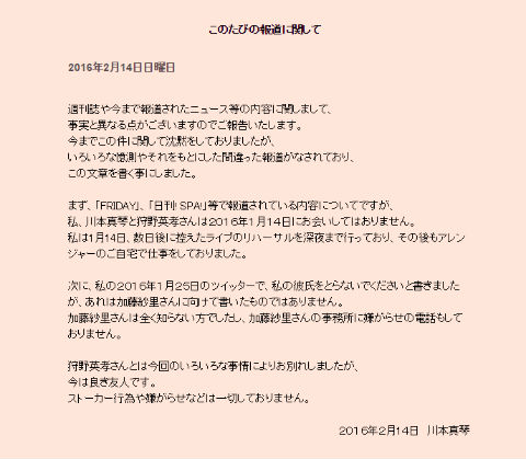 「狩野英孝さんとは今回のいろいろな事情によりお別れしましたが、今は良き友人です」としてストーカーや嫌がらせはしていないとも述べています。