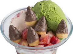 春を連想させるピンクのいちごアイスと竹やぶの緑をイメージした抹茶アイスに「たけのこの里」をトッピング。アイスの下にも「たけのこの里」を1つ隠すおちゃめな一品となっています。
