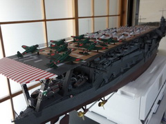 制作期間は6カ月。手すりや空中線などどうしても紙で再現できない部分には針金や糸など使用しているとのことだが、艦載機はもちろん飛行甲板や機銃など大部分は紙で作られている。200分の1サイズとはいえ全長120センチにもおよび、特に飛行甲板裏のトラスに時間を割いたという。