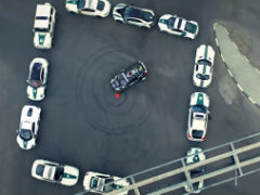 砂漠を抜けると、ドバイの高速道路「シェイク・ザーイド・ロード」を爆走。この撮影のためだけに、ブッシュ大統領の訪問以来2度目の封鎖を行ったそうです。高速道路の出口で待ち構えるパトカーたち。フェラーリ、ポルシェ、ベンツとドバイ警察のリッチさがうかがい知れます。豪勢なパトカーの円陣内で旋回しまくったあと、そのまま市街地へ突入。今度は片輪走行しているピックアップトラックの真下を旋回開始。こら舐めプですわ。