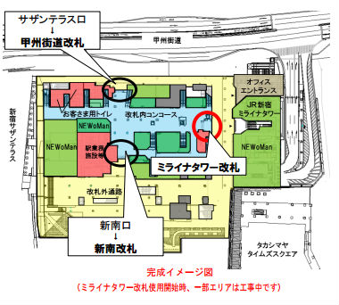 今春に予定している複合ビル「JR新宿ミライナタワー」の開業に合わせて設けられたもの。合わせて、「サザンテラス口」は「甲州街道改札」に、「新南口」は「新南改札」に変更します。