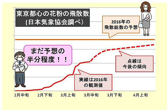 花粉症の方には、つらい時期となっていますが、東京で、これまでに実際に飛散した花粉の数は、今シーズンの予想のまだ半分程度となっています。今週後半は春本番の陽気で、花粉が大量に飛ぶ見込みで、万全な対策を。