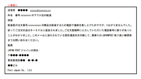 メールの文面は、商品を届けようとしたが電話番号が間違っており電話がつながらず、商品をターミナルに返送したというもの。メールに添付された運送状を印刷して、郵便局へ問い合わせるよう受信者に求めている。メールでは「JAPAN POST」「日本郵政」「日本郵政ジャパン」「JAPAN POSTジャパン」などと名乗っている。