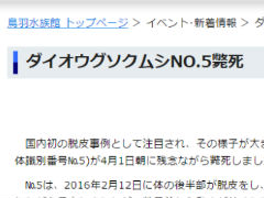 鳥羽水族館(三重県鳥羽市)が4月1日、ダイオウグソクムシ(個体識別番号№5)が同日朝に死んだことを発表しました。2月に国内で初めて脱皮が確認されたとして話題になっていました(関連記事)。