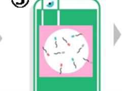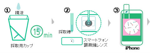販売するのはスマートフォン顕微鏡レンズ、精子採取カップ、採取棒のセット。さらに専用のiPhoneアプリ(無料)が必要です。精液をスマートフォン顕微鏡レンズの上に1滴載せ、レンズをiPhoneにセットして専用アプリで動画を撮影すると、動画がプログラムで自動解析され、精子の濃度と運動率が表示されます。