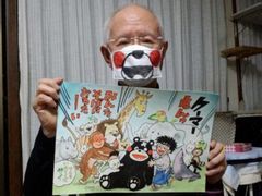 イラストは、ちばさんの代表作「おれは鉄兵」の上杉鉄平と動物たちが、傷ついたくまモンを囲んで「クーマーもんっ みんなそばにおるたーい」と熊本弁で励ましている内容。今年で77歳となったでちばさんは、くまモンの口と鼻を描いたマスクを顔につけながら、イラストを自ら両手で掲げる写真も投稿しています。
