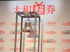 超まるなげひろば内、大和超券ステージに、ひときわ目立つきれいな鐘。これは株式上場の際に法人の代表者が鳴らす「あの鐘」を忠実に再現したものなのですが、今回来場者が鳴らすことができるというので、鳴らしてきました。