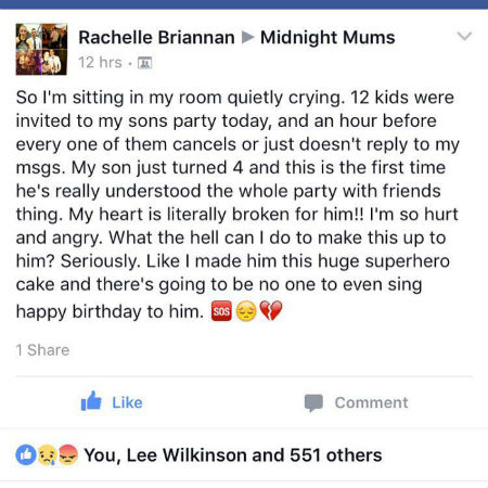 発端はオーストラリアのメルボルンに住むRachelle Briannanさんが、Facebookの母親向けコミュニティーMidnight Mumsに書き込んだ投稿でした。息子の4歳の誕生日パーティーに12人の子どもを招待したのに、そのすべてが直前になって断るか、返事をしないという状況に陥ったと説明。息子が友達とのパーティーというものを理解できるようになってから、初めての誕生日パーティーなのだそうです。「部屋でこっそり泣いています」「息子にどうやって埋め合わせをしたらいいのでしょう?」と、Briannanさんは悲痛な心情をつづっていました。