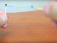 用意するものは、マッチ棒を2本と輪ゴム1本。最初に輪ゴムの中心を指でつまみ、先端を半分に折ります。小さな穴が2つできるので、ひねりながら横向きに折って穴同士を向かい合わせ、2つの穴の中心にマッチ棒を挿して結びます