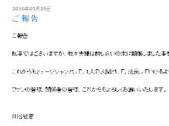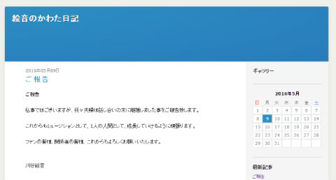 話し合いの末に離婚したとし「これからもミュージシャンとして、1人の人間として成長していけるように頑張ります。ファンの皆様、関係者の皆様、これからもよろしくお願いいたします」とつづっている。