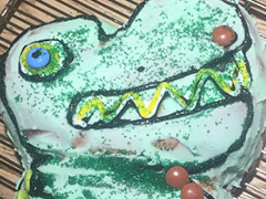 出来上がったのは、ミントクリームと思われる色のクリームでコーティングされ、マーブルチョコレートでデコレーションを施されたティラノザウルス・ケーキ。彼は、このケーキに、スペイン語と英語で「ラ・ティーレックス・アル・ラ・チョコレート(チョコレート・ティラノサウルス)」と名付けています。