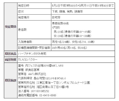飲食した来場者から体調不良の連絡が複数件あり、それぞれ江東区保健所、福岡市中央区保健福祉センターが調査したところ、イベント内で販売した「ハーブチキンささみ寿司」「鶏むね肉のたたき寿司」がカンピロバクター菌に感染していたことが判明。