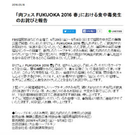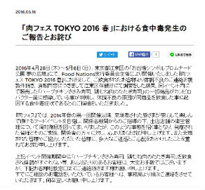 4月28日から5月8日まで開催された「肉フェス TOKYO 2016 春」「肉フェス FUKUOKA 2016 春」で、食中毒の疑いがある事案が発生した件について、保健所の調査で食中毒だったことが断定されました。
