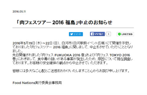 5月19日〜22日に予定していた「肉フェスツアー 2016 福島」は、来客の安全確保のため中止となっています。