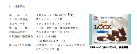 不二家は5月17日、「焼きルック(塩バニラ)MP」の自主回収を発表しました。一部に製造設備の部品の破片が混入したため。