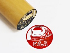 痛印は好きなイラストと文字を組み合わせるオーダーメイドの印鑑。今回の痛印にはE2「はやて」〜E7系「かがやき」と北海道新幹線 H5系が各2種類ずつ、合計14種類のイラストが用意されています。18ミリの丸印で価格は3580円、材料には柘植(つげ)を使っており、実名を入れれば銀行印として使えます。