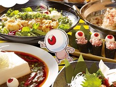 目玉おやじとのコラボメニューは、コース料理と単品料理が用意されており、目玉おやじが薦めている「目玉のスペシャルコース」は、目玉の軍艦・ちゃんちゃんこ風玉子焼・ぬりかべチキン南蛮など、全8品の料理に飲み放題が付いて4000円です(税込、2人以上から)。
