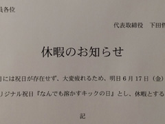 「出社したら素晴らしいお知らせが貼られていました」と貼り紙の写真をツイートしたのは、バーグハンバーグバーグのまきのゆうきさん(@yuuki)。貼り紙は社長のシモダテツヤさんからのもので、6月17日を急きょ「なんでも溶かすキックの日」とし、休暇とする旨が書いてありました。同じくバーグハンバーグバーグで働くブロガーのARuFaさん(@ARuFa_FARu)も「ムチャクチャな理由で明日会社が休みになりました」と写真をツイートしています。