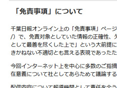 千葉日報オンラインは6月20日、サイトの「免責事項」に記載されていた「情報の正確性を保証いたしません。また、情報の欠陥が必ず修正されるという保証もいたしません」などの文言について、誤解を招きかねず不適切な表現であったとし、サイトから削除しました。