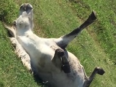 馬の名前は、ピント。アメリカのテキサス州で暮らす、小さくて真っ白な馬だ。動画は、車の助手席から牧場を映し出しているところから始まる。一頭の白馬と犬が映しだされ、そのなかの白馬が、なんとひっくり返っているではないか。