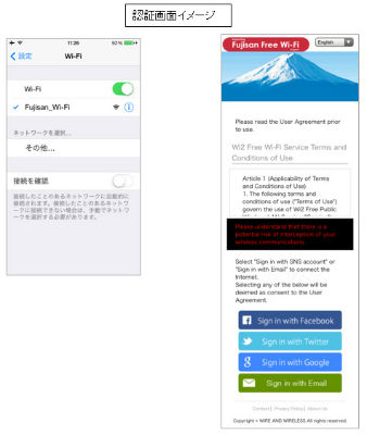 富士山の全山小屋を含む49カ所、さらに富士山静岡空港で利用可能。認証にはSNSアカウントまたは電子メールを使用しています。また訪日外国人向けアプリ「TRAVEL JAPAN Wi-Fi」では自動的にWi-Fiに接続可能です。