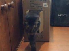 箱に入ってすぐ、1秒もしないうちに三毛猫が箱からでてきた……と思ったら、見た目が黒い猫になって登場。なんという早着替え。まるで別の猫にすり替わったかのように身体の色が変わっています。箱も1匹くらいしか入れなそうな大きさだし、まさか“中に居た別の黒い猫と三毛猫が入れ替わった”なんてことはきっとないはず……!