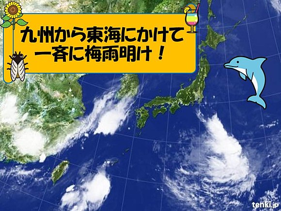 18日午前11時、九州南部(奄美地方を除く)、九州北部、中国、四国、近畿、東海で続々と梅雨明けの発表がありました。