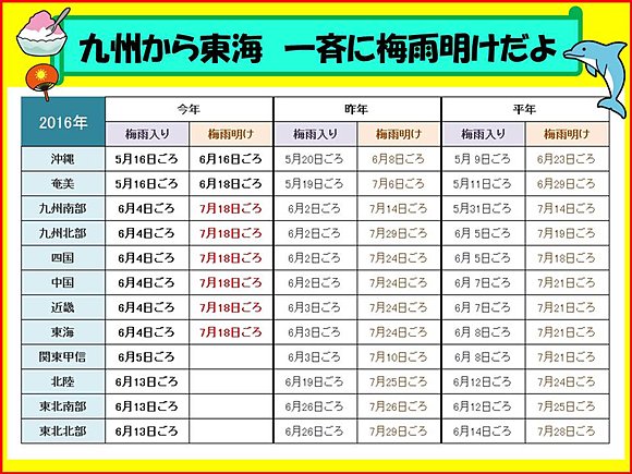 • 東海→平年より3日早く、昨年より6日早い 梅雨明けです。