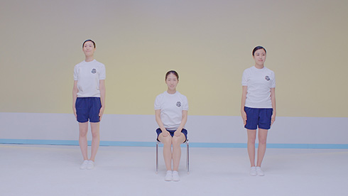 イマドキ集合写真の体操。両足跳びから斜め後ろに跳びましょう