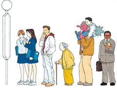 今回、既存のイラストをベースに山交バスの協力を得て背景にバスの車体を新たに追加し、「新庄駅前」の文字を重ねたんだそうです。ちなみにイラスト制作当時、作者の冨樫義博さんは「かむてん」はいたずら好きのじいさん天狗という設定で、「わたしの頭の中の家族構成は、三世代の7人家族ということであるのですが……。天狗の家族がテーマだったのですが、私自身、ひねくれ者なので、あえて家族を描かないで、街にとけこんでいる雰囲気だけを表現してみました」と語っています。このバス停に並んでいるイラストはそんなイメージを唯一表現したものだったのではないでしょうか。