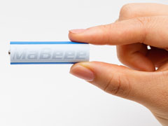 単三サイズの本体に市販の単四形電池を入れ、通常の電池と同様に使用。専用アプリからBluetooth経由で、電池の出力を制御できます。ミニ四駆やプラレールなどに装着すれば、スマートフォンをリモコン代わりにして遠隔操作が可能に。直列接続で4本までの単三形電池で動作する製品であれば、1本をMaBeeeに変更するだけで適用できます。