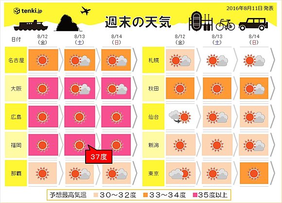 こちらも週末にかけて晴れる所が多いでしょう。ただ、東海は湿った空気が流れ込みやすく、すっきりと晴れない所も。局地的ですが、にわか雨の可能性もありますので、屋外のレジャーは念のため急な雨への対策をとっておきましょう。各地とも体にこたえる暑さが続きます。名古屋は週末も最高気温が33度を超える予想。35度以上の猛暑日となる所もあるでしょう。