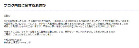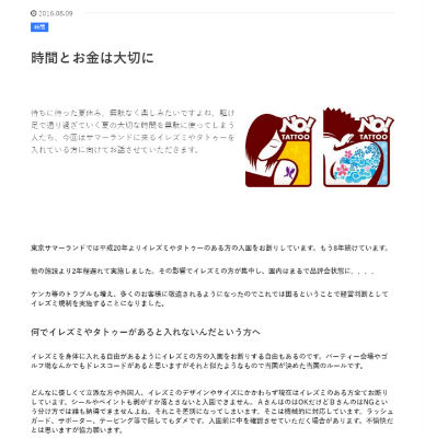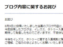 当該のブログは8月9日に「時間とお金は大切に」というタイトルで投稿されたもの。現在は削除されています。ブログの内容は、同園では8年前からイレズミやタトゥーのある人の入園を断っているとあらためて説明するもの。他の施設より2年ほど遅れて規制を実施した影響でイレズミの来園者が集中し、ケンカ等のトラブルも増えたと、規制を実施した経緯をつづっています。