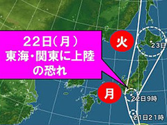 台風9号は22日(月)に東海から関東に上陸の恐れ。雨や風のピークは22日昼前から夜。通勤の帰宅時間帯とも重なるため交通機関の乱れをはじめ低い土地の浸水など厳重警戒。