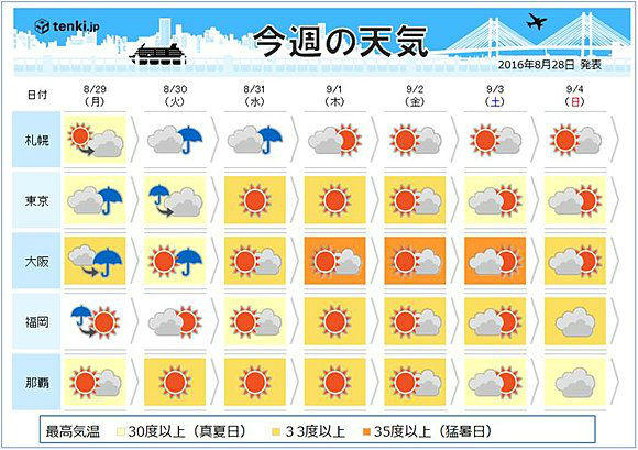 台風が北上したあとは、本州付近は高気圧に覆われて、西から天気が回復する見込みです。東北と北海道も9月1日(木)頃からは日差しが戻るでしょう。週末にかけては全国的に晴れる見込みです。