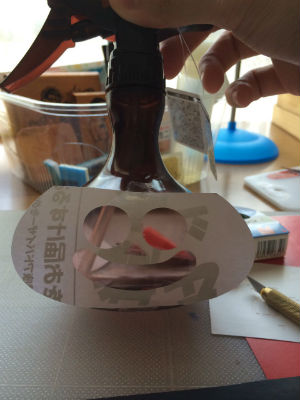 詳しい作り方を聞いたところ、目や口には耐水のためカッティングシートを使用しているとのこと。まずボトルの底の直径を計測して切り出すパーツの大きさを決定。目のパーツは黒・白黒の三層、口は二層。それぞれ貼り合わせてパーツを作ります。